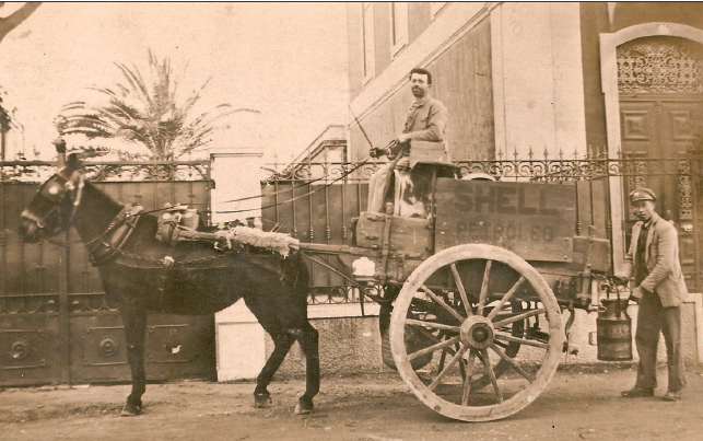 mula e conduzida por Manuel dos Santos (o Manel maneta) levando petróleo; a carroça do