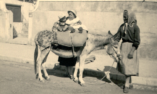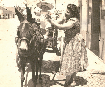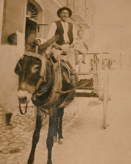 Joaquim Tavares Lopes com o burro “Faísca” transportando mercearias e carvão; a carroça